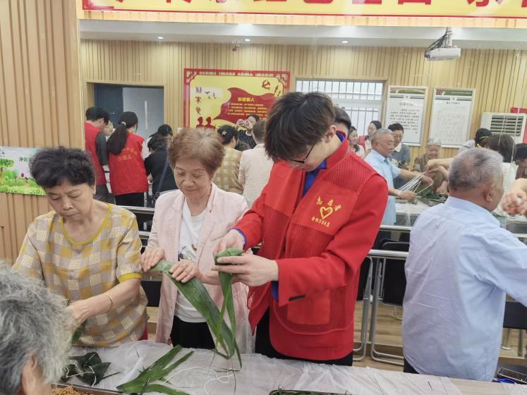 活动现场,金帆万源酒店提前准备好粽叶、糯米、蜜枣等材料,和社区居民欢聚一堂包粽子。大家双手翻飞,捋粽叶、做漏斗、填糯米、压紧实、封口扎捆,一片片粽叶、一粒粒糯米、一张张笑脸,缠绕出一个个甜蜜的粽子。大家互相交流包粽子的技巧,共话端午文化,经验丰富的社区老人边包边向年轻人们传授经验,手指穿梭间一会儿的工夫,一只只棱角分明、饱满的大粽子就呈现在了大家面前,活动现场充满浓郁的端午气息,气氛欢乐祥和,欢声笑语不断。