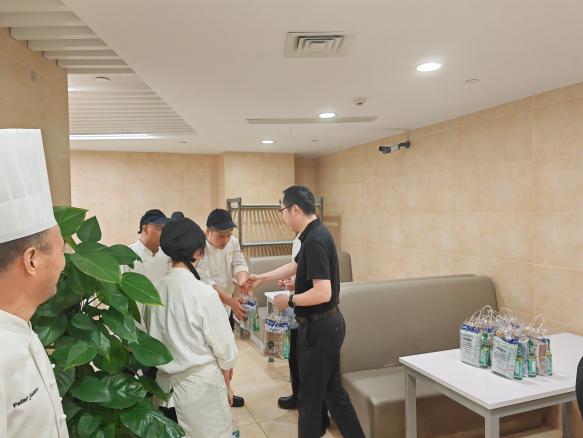 为做好防暑降温工作,保障一线员工的安全健康,保障酒店有序推进。公司为一线员工送上绿豆汤等防暑降温物品,宣传防暑降温知识,合理安排作业时间,切实保障员工身心健康安全。 为满足夏季员工饮食需求,公司食堂为员工准备了清凉解暑的特色菜,确保员工在炎炎夏日吃得健康。